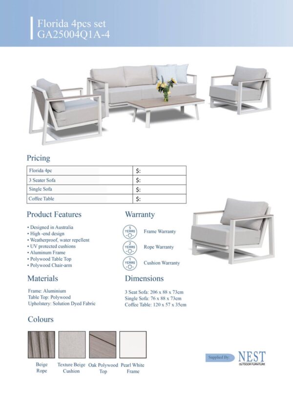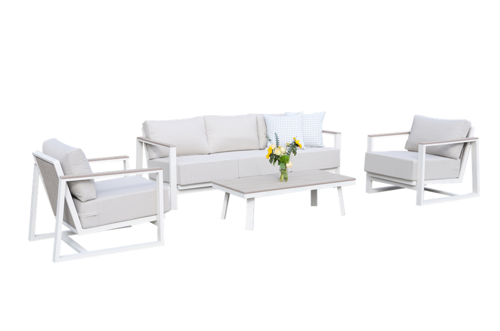 The Florida 4 Piece Lounge Setting consists of one 3 seater sofa, 2 x single sofa’s, and a polywood coffee table.