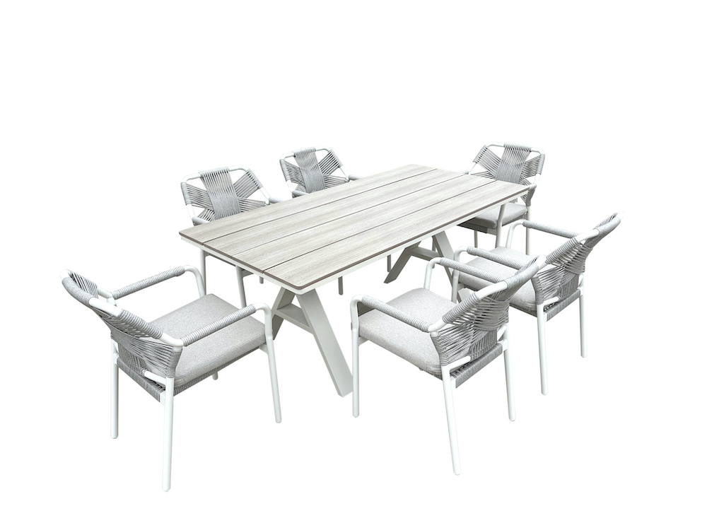 The Havana 7 Piece Dining Set includes 6 x Havana single chairs and a 180 x 90cm polywood dining table.