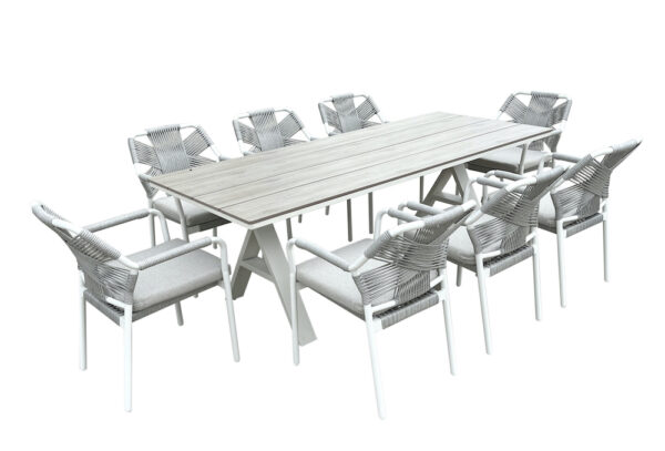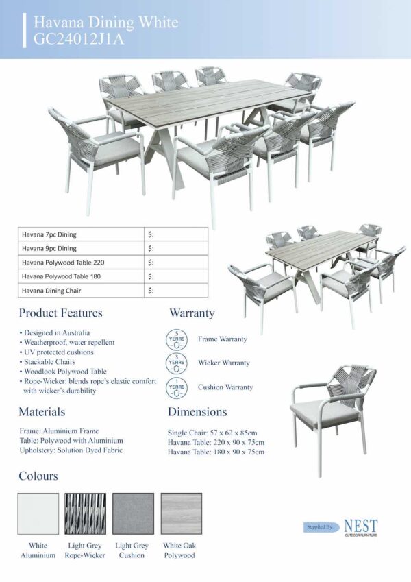 The Havana 9 Piece Dining Set includes 8 x Havana single chairs and a 220 x 90cm polywood dining table.